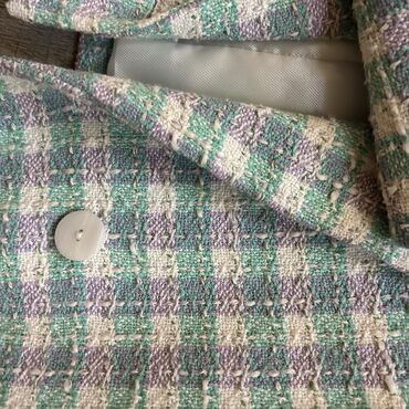 - Detalji: strukturirana tkanina sa dekorativnim čvorićima karakterističnim za tvid; uredno podvučeni rubovi