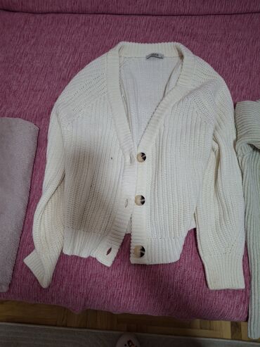 - Kardigan: krem boje, V-izrez, krupnije pletivo. Kopčanje na tri velika okrugla dugmeta napred, rebrani porub i manžetne. Praktičan sloj preko majica i haljina.