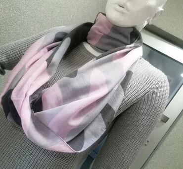 Ženski beskonačni šal (tube/loop model) - Dizajn: apstraktni print u nijansama svetloružičaste, sive i antracit. - Oblik: zatvorena petlja – lako se dva puta obmota oko vrata za ležeran ili puniji...