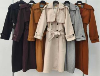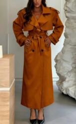 Moderan ženski kaput/trenč, dužine do članka, sa vezivanjem u struku i dvorednim dugmadima. Široke rever kragne i dekorativni gornji preklop daju efekat oversized siluete, dok pojas naglašava struk. Rukavi imaju kaišiće sa dugmetom za podešavanje, a na ramenima su epoletne. Ravna, elegantna linija kroja pogodna je za svakodnevne i svečanije kombinacije.