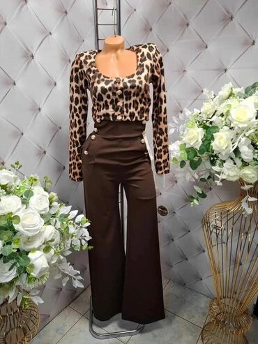 - Boje: leopard print (bež/crna/smeđa) + tamno braon pantalone sa zlatnim akcentima.