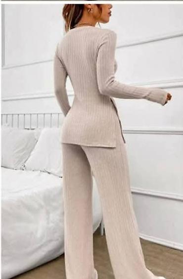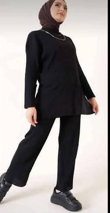 Komplet za žene – široka tunika i pantalone sa printom - Gornji deo: crna, lepršava tunika sa spuštenim ramenima i asimetričnim, dužim zadnjim delom. Okrugli izrez, komotan kroj sa slojevitim efek...
