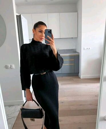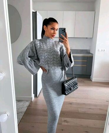 - Moderan set: kratki pulover sa rupičastim dezenom i džemper-kragna + uska midi suknja visokog struka