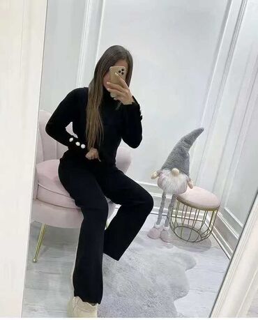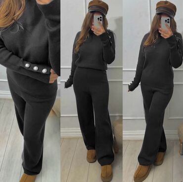Dvodijelni ženski pleteni komplet – duks i pantalone širokih nogavica. - Materijal: mekani pleteni triko, elastičan i udoban za celodnevno nošenje. - Gornji deo: ravni okrugli izrez, spuštena rame...