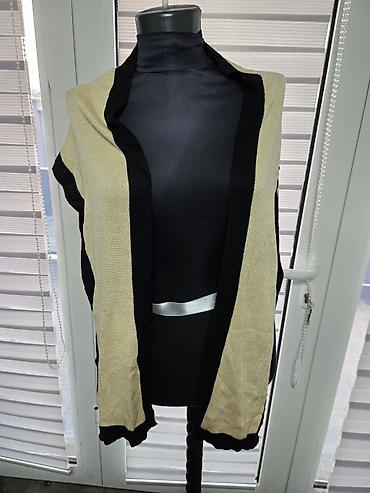 Pletena pončo-šal marama sa resama - Model: pončo/ogrtač bez rukava, nosi se prebačen preko ramena - Dizajn: geometrijski pruge i linije; kombinacija tamnobraon i crne boje - Materijal: topla, me...