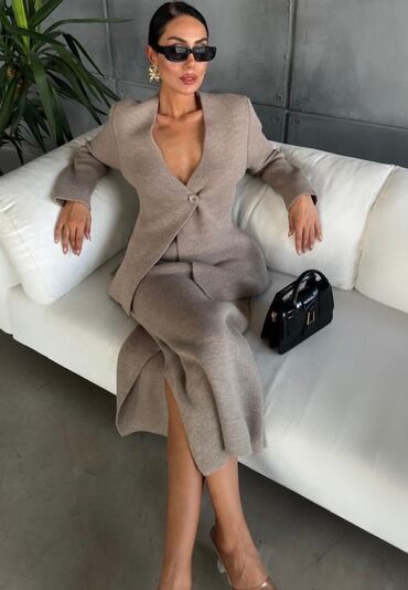- Detalji: jednoredno kopčanje; diskretan šlic na suknji; ravne ivice i precizni šavovi koji naglašavaju siluetu.