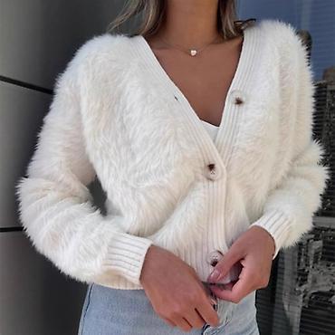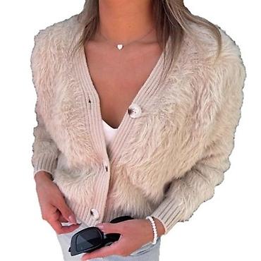 - Dizajn: mekana, „furry“ tekstura po celoj površini; V‑izrez; spuštena ramena; rebrani manžetni i porub
