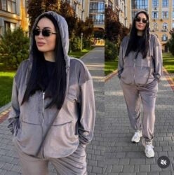 - Moderni komplet od mekanog, sjajnog pliša: duks na rajsferšlus s kapuljačom i klokan džepovima + donji deo sa elastičnim pojasom i nogavicama.