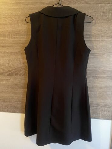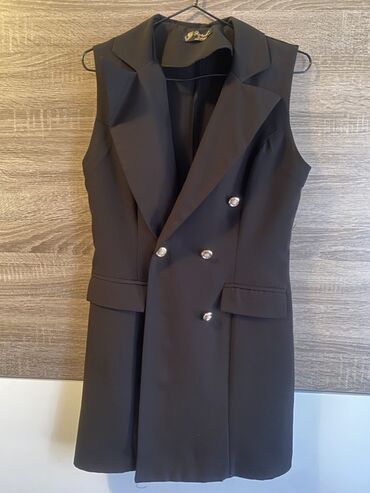 Royal ClassElegantni ženski prsluk/haljina bez rukava, crne boje, dužine do iznad kolena. Model u stilu sakoa sa širokim reverima i dvorednim kopčanjem. Prednji deo ima četiri dekorativna metalna/džin kopčeta sa sjajnim detaljem i dva lažna preklopna džepa za klasičan izgled. Struk je blago strukiran, leđa glatka sa centralnim šavom za lepšu siluetu. Materijal je čvrst i lepo pada, pogodan za poslovne i svečane kombinacije – može se nositi kao dugački prsluk preko košulje/rolke ili samostalno kao mini haljina. Boja: crna. Brand oznaka: Royal.