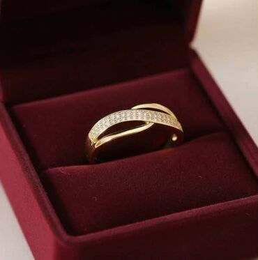 Elegantni ženski prsten od žutog metala sa modernim “twist” dizajnom. Gornji deo prstena čine dve ukrštene trake: jedna glatko polirana, druga gusto ukrašena sitnim, briljantno sečenim kamenčićima koji daju diskretan sjaj. Širina obruča srednja, sa zaobljenom unutrašnjošću radi udobnog nošenja.