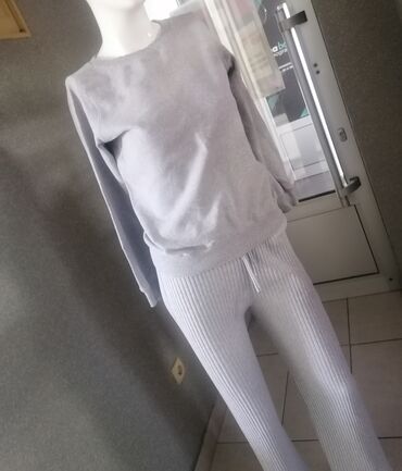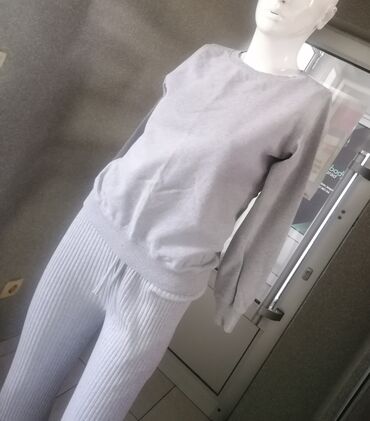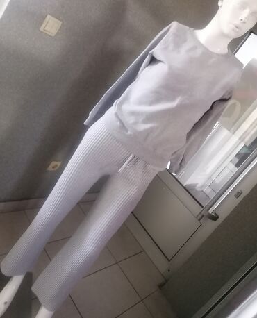 Komplet za žene u svetlosivoj boji, sastavljen od gornjeg dela dugih rukava i donjeg dela sa rebrastom teksturom. Gornji deo je klasičnog kroja sa okruglim izrezom oko vrata, dok donji deo ima elastičan pojas sa učkurom za podešavanje. Rebrasti materijal pruža udobnost i fleksibilnost, idealan za svakodnevno nošenje ili opuštene prilike. Ovaj komplet je pogodan za različite kombinacije, može se nositi zajedno ili odvojeno.