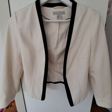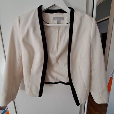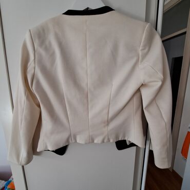 - Boja: krem/boja slonovače sa crnim obrubom duž revera i donje ivice