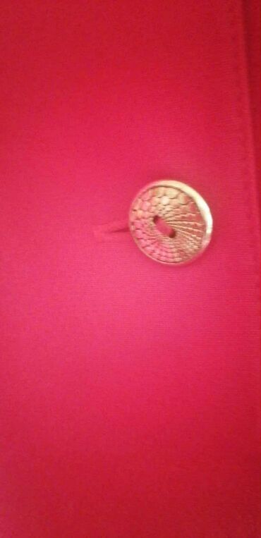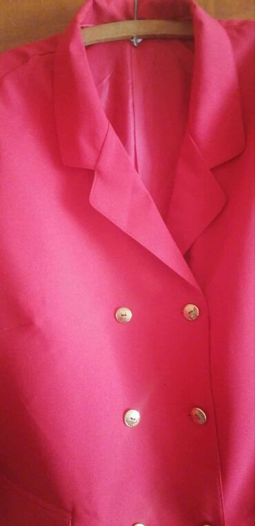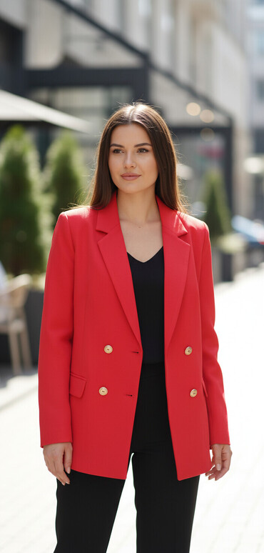 DugmadŽenski sako u jarko ružičastoj/ ciklama boji. Klasican kroj sa reverima, dužina preko kukova. Dvoredno kopčanje sa šest dekorativnih zlatnih dugmadi sa reljefnim motivom. Dva prednja džepa sa preklopom. Ravne, duže rukave. Unutrašnja postava u istoj nijansi. Elegantna i efektna varijanta za poslovne i svečane kombinacije. Materijal glatke teksture, prijatan na dodir.Boja je crvena