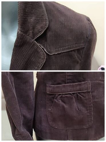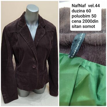 Ženska lagana jakna/sako u tamno braon boji. - Kroj: kratki sako/lagana jakna, bez kragne, ravnog izreza - Kopčanje: četiri velika dugmeta napred - Rukavi: 3/4 dužina - Džepovi: dva prednja našive...