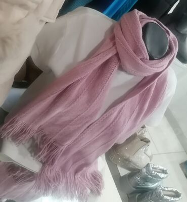 - Pleteni šal u prljavo‑roze boji, sa diskretnim reljefnim šarama i resama na krajevima. Mekan i topao, prikladan za zimu i hladnije dane. Lako se uklapa uz kapute, jakne i ležerne outfite.