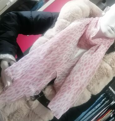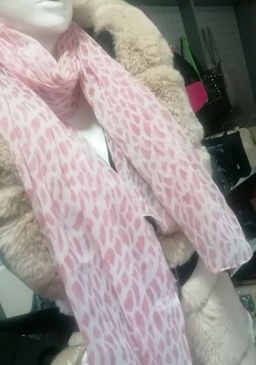 - Prozirni, lagani šal od šifona sa suptilnim životinjskim (leopard) printom u svetlo‑roze i puder tonovima. Veoma dugačak i širok, pogodan za obmotavanje oko vrata ili ramena. Lepršav, idealan za slojevito stilizovanje tokom proleća i jeseni, kao i za elegantne kombinacije.