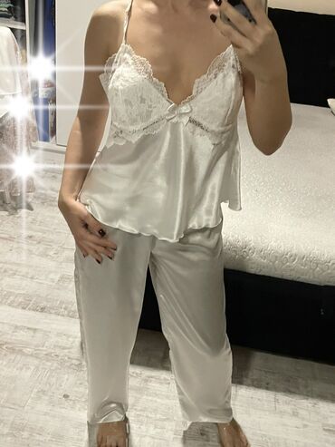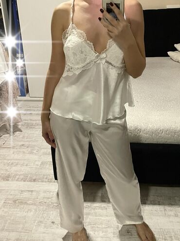 O trošku kupcaElegantan ženski komplet pidžame od satena, idealan za opuštanje kod kuće. Komplet se sastoji od pantalona, majice na bratele i bade-mantila, sve u beloj boji sa diskretnim čipkastim detaljima. Gornji deo na bratele ima V-izrez sa čipkom i malom mašnom na sredini, dok bade-mantil ima duge rukave sa čipkom na manžetnama i čipkaste aplikacije na ramenima. Pantalone su dugačke, sa čipkastim rubom na dnu. Materijal pruža osećaj luksuza i udobnosti.