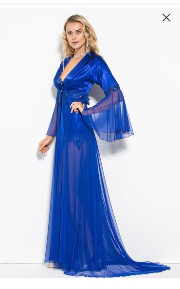 O trošku kupcaElegantan ženski set koji se sastoji od duge spavaćice i ogrtača u kraljevsko plavoj boji. Spavaćica ima tanke bretele, dok ogrtač ima široke zvonaste rukave i čipkaste detalje. Oba dela su izrađena od kombinacije satena i prozirnog tila, što stvara sofisticiran i prozračan izgled. Dugi kroj i transparentni donji deo ogrtača i spavaćice daju celom setu prefinjen i luksuzan izgled, dok čipkani detalji dodaju notu ženstvenosti. Idealan je za posebne prilike ili za osećaj elegancije kod kuće.