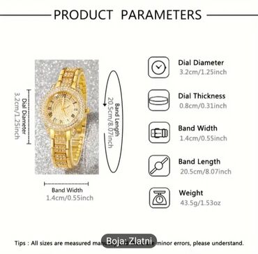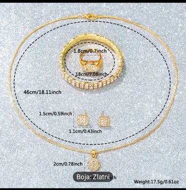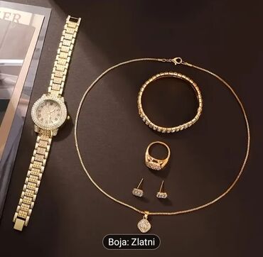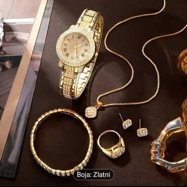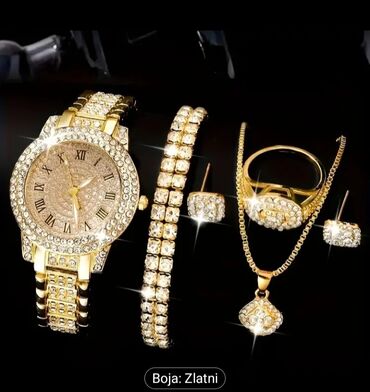 Elegantan set nakita i sata u zlatnoj boji, ukrašen svetlucavim kamenčićima. Set obuhvata ručni sat sa okruglim brojčanikom i rimskim brojevima, narukvicu, prsten i minđuše, kao i ogrlicu sa priveskom. Dizajniran je da doda sofisticiranost svakom izgledu, idealan za specijalne prilike ili kao moderan dodatak svakodnevnom stilu. Nudi kompletan, usklađen izgled, čineći ga pogodnim za razne događaje.
