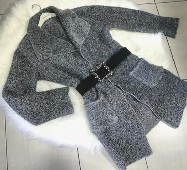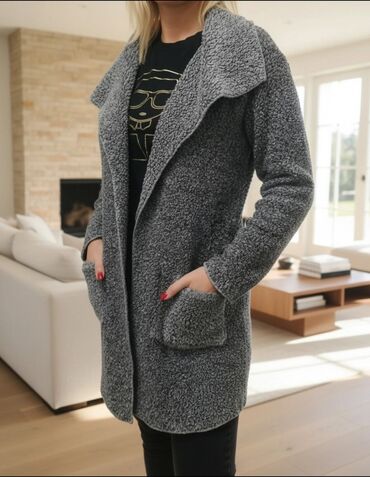 Ženski mekani kardigan/kaput od “teddy” (buklé) materijala u sivoj boji.