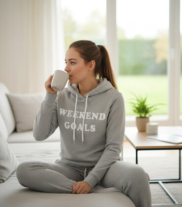 - Gornji deo: mekana dukserica sa kapuljačom i podešavajućim učkurima; natpis “WEEKEND GOALS” sprijeda; duži, topli rol-otvor oko vrata za dodatnu udobnost; elastične ranfle na rukavima
