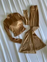- Pantalone: visok struk sa elastičnim pojasom, uska nogavica koja se blago širi ka dnu (flare efekt)
