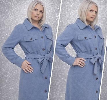 Dugački ženski kaput/šaket u svetloplavoj boji.