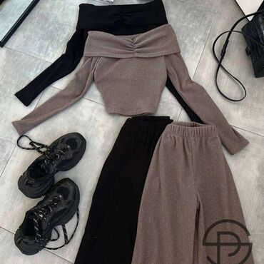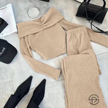 Ženski komplet – plisirani set od dva dela u toploj braon boji. - Gornji deo: preklopni crop top sa V-izrezom, dugačkim rukavima i lastišem na manžetnama. Povez u struku omogućava vezivanje i pril...