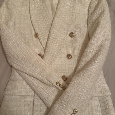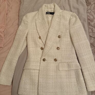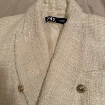 Klasičan, chic model koji lako podiže svaku kombinaciju. Brend: ZARA (etiketa vidljiva na fotografiji). Boja: krem/ivory. Kroj: dvoredni, strukiran. Detalji: zlatni metalni dugmići, džepovi sa preklopom, postava.