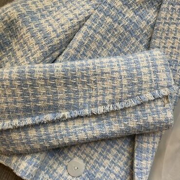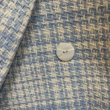 - Materijal: tvid tekstura sa istaknutim pletenim uzorkom u nežno plavoj i krem/bež boji.