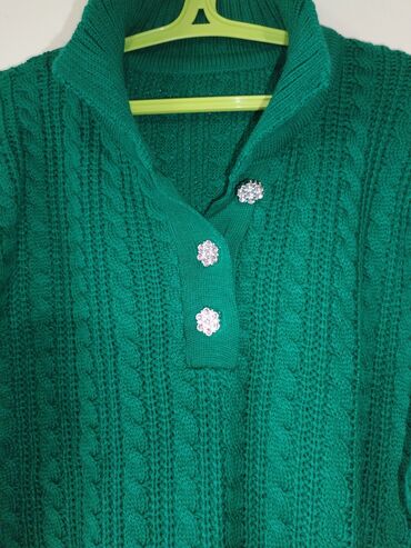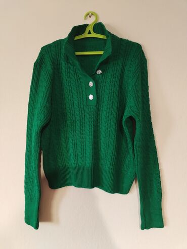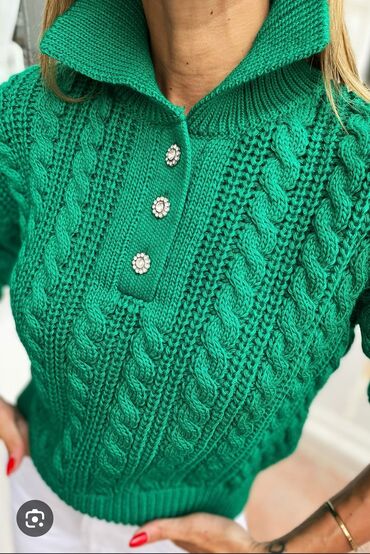 Zeleni ženski džemper sa pletenim kablovskim uzorkom i kragnom.