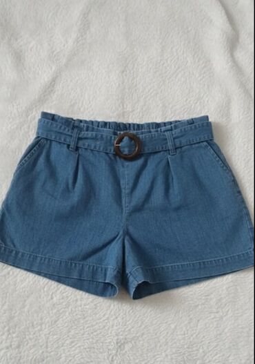 - Šorts: svetlo-plavi teksas, visoki struk sa lastišem pozadi, uključen kaiš od istog materijala sa okruglom tamnom kopčom napred. Prednji nabori i bočni džepovi. Ravne nogavice, kratka dužina.