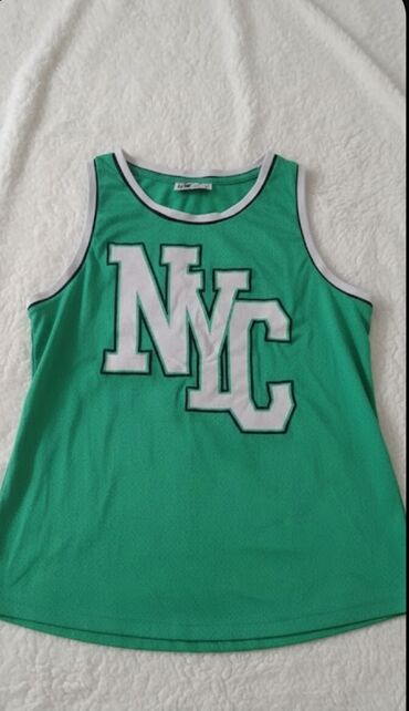 - Top: atletski kroj, mrežasti sportski materijal, zelena boja sa belim i crnim obrubom oko okovratnika i rukavnih izreza. Veliki plišani/3D aplikativni natpis “NYC” na prednjoj strani.