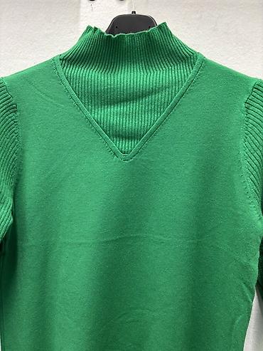 - Zeleni pleteni džemper sa zanimljivim slojevitim izgledom oko izreza: spolja V-izrez, a ispod rebrasti „mock“ rol-kragna za dodatnu toplinu i moderan kontrast. Rebraste rukave i porub, elastične ranfle.