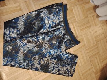 - Materijal: bogati žakard sa reljefnim cvetnim motivom; kombinacija tamnoplave, srebrne, crne i maslinaste nijanse sa metalik odsjajem.