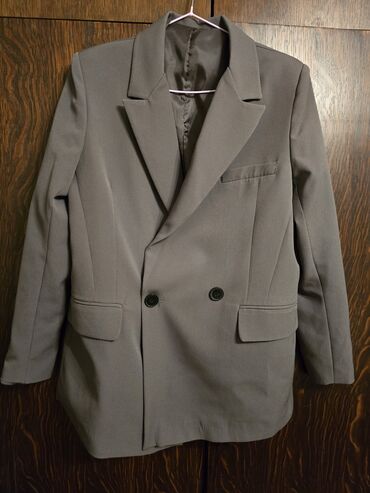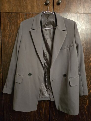 - Kroj: moderni oversized sako sa duplim kopčanjem (dva dugmeta), klasičnim reverima i blago strukiranim linijama; ravne pantalone sa širim nogavicama.