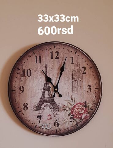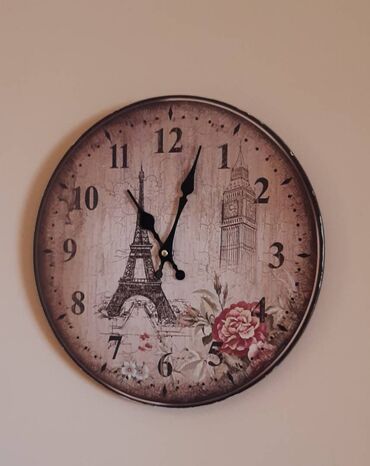 - Okrugli zidni sat sa ilustracijama Ajfelove kule i Big Bena, uz dekor cvetova i retro patinu.