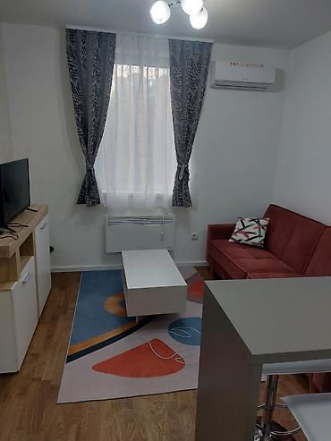 Namešten jednosoban stan – funkcionalan raspored i kompletna opremljenost - Dnevni boravak sa ugaonom garniturom, foteljom, klub stočićem, TV-om, vitrinom i trpezarijskim stolom sa stolicama. Pod ...