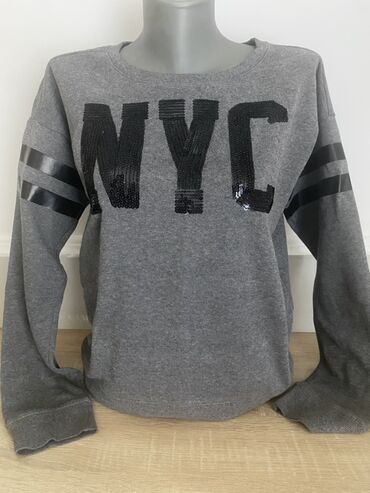 Terranova dukserica, veličina Medium. Siva boja, klasičan okrugli izrez i duži rukavi. Napred veliki natpis “NYC” ukrašen crnim šljokicama. Na rukavima po dve crne sjajne trake kao detalj. Mekana unutrašnjost od flisa za dodatnu udobnost i toplotu. Idealan komad za svakodnevno nošenje, uz farmerke ili trenerku.