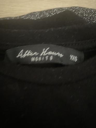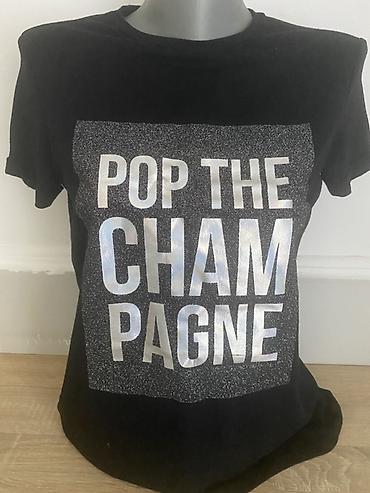Crna ženska majica kratkih rukava brenda Mohito – linija After Hours. Na prednjem delu ima veliki srebrni/holografski natpis “POP THE CHAMPAGNE” postavljen na svetlucavom pravougaoniku. Okrugao izrez, klasičan kroj, mekana pamučna tkanina sa blagim elastinom za udobno pristajanje. Veličina: 34/XS (naznačeno na etiketi). Idealan komad za večernje izlaske i party kombinacije.