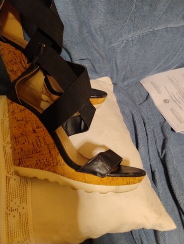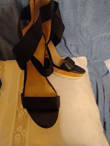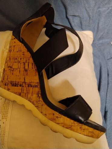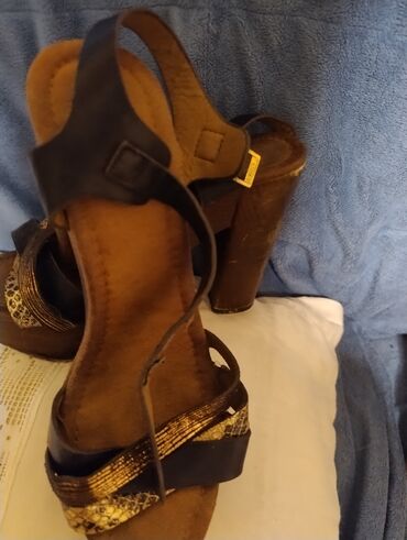 Ženske sandale na platformu - Veličina: 39 (oznaka na đonu) - Gornji deo: kombinacija crne trake i trake u printu imitacije zmijske kože - Kopčanje: dve metalne kopče sa bočne strane za podešavanj...