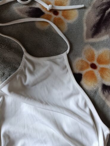 Ženski prsluk/majica bez rukava sa printom - Model: bez rukava, blago nabran gornji deo sa trakom/vezicom oko vrata - Dizajn: tamna podloga sa sitnim cvetnim/geometrijskim motivima u žuto-belim to...