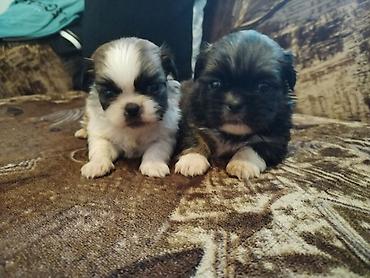 - Dva šteneta sitne građe, kratke njuškice i bogate, meke dlake.