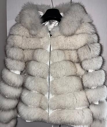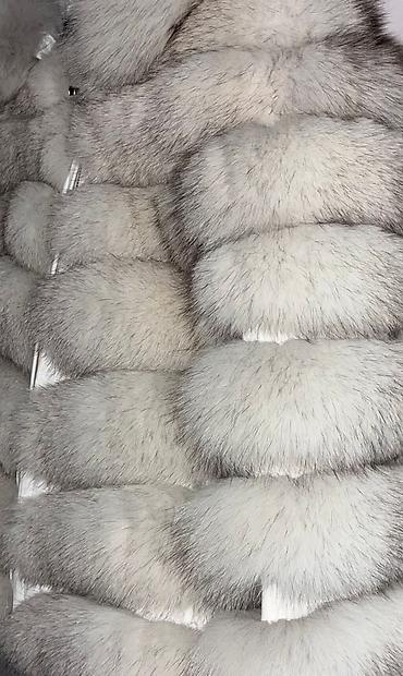 Luksuzna ženska bunda u srebrno-sivoj nijansi, kratkog kroja. Model je izrađen od bogatih, poprečnih pufnastih segmenata koji daju izražen volumen i termičku izolaciju. Poseduje: