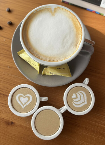 - Realističan izgled pene/kafe u bež tonovima, sa detaljno izvedenim “latte art” dizajnima (srce, roseta) i jednobojnom varijantom bez šare
