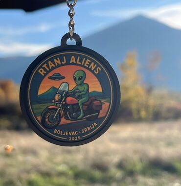 Primeri na fotografijama: motiv testere sa natpisom, zupčanik sa tekstom, okrugli bedž “Rtanj Aliens 2025”, kvadratni motiv ventilatora i pločica sa natpisom.