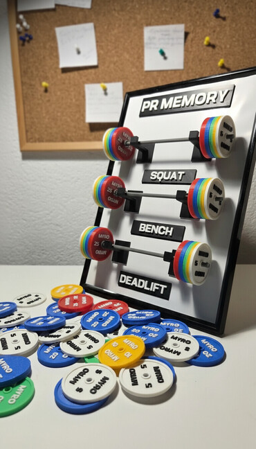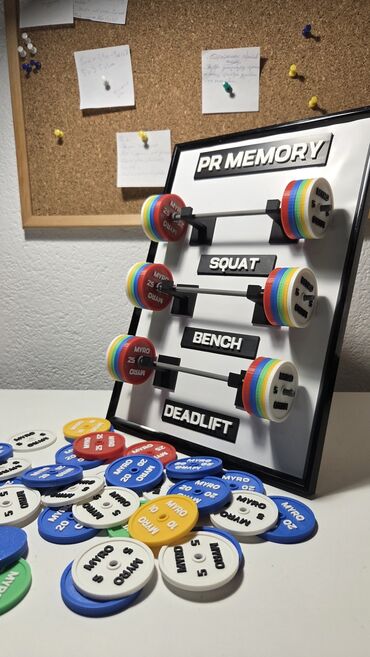 - Zidna/stojeća tabla sa 3 mini šipke za beleženje PR-ova u čučnju, benchu i deadliftu (natpisi: PR MEMORY, SQUAT, BENCH, DEADLIFT ili koji vi želite).