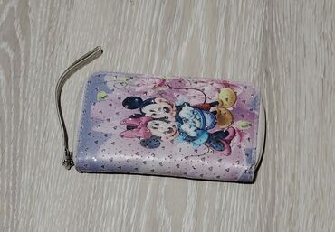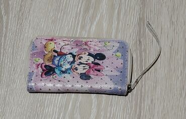 Dečji novčanik sa rajsferšlusom i kaišićem za zglob. Spoljašnost u pastelnim tonovima (roze/lila) sa sjajnim detaljima u obliku sitnih srca i ilustracijom popularnih crtanih likova. Materijal glatke, lako održive površine.