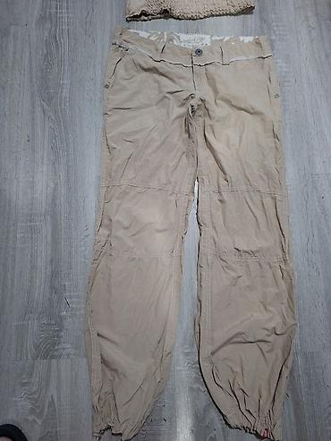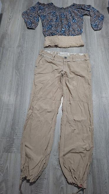 - Pantalone: bež cargo model, “edc by Esprit”. Ravan kroj sa širim nogavicama, štepani paneli duž nogu, duboki bočni džepovi i paspulirani zadnji džepovi sa dugmetom. Kopčanje na dugme i rajsferšlus. Uvučene vezice na rubovima nogavica za podešavanje širine/dužine.