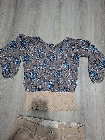 - Bluza: lagana, boho kroj s 3/4 rukavima. Braon podloga sa plavo-belim cvetnim dezenom. Elastična širina oko izreza (može da se nosi i blago spušteno preko ramena) i široka elastična traka u pojasu u bež tonu koja lepo prijanja uz struk.